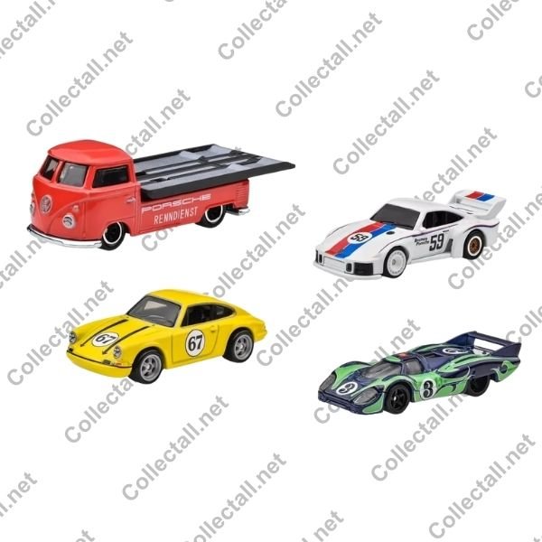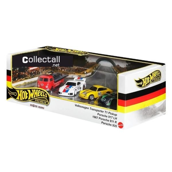 Hot Wheels Premium 2024 yılı German Racers Premium Collector Set. Setin içerisinde 4 farklı araç yer almakta. Set içerisindeki araçlar kırmızı renk Volkswagen Transporter T1 Pickup, beyaz renk Porsche 935, sarı renk 1967 Porsche 911 R ve mavi-yeşil renk Porsche 917 LH.
