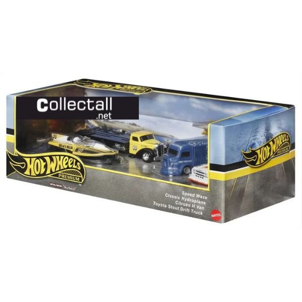 Hot Wheels Premium 2024 yılı Vintage Race Team Premium Collector Set. Setin içerisinde 4 farklı araç yer almakta. Set içerisindeki araçlar sarı renk Classic Hydroplane, sarı renk Speed Waze, mavi renk Citoren H Van ve beyaz renk Toyota Stout Drift Truck.