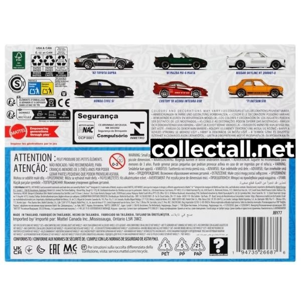 Hot Wheels 2025 yılına ait 6 farklı araçtan oluşan Japanese Car Culture 6'lı paket. Paket içerisindeki araçlar ‘82 Toyota Supra, ’91 Mazda MX-5 Miata, Nissan Skyline HT 2000GT-X, Honda Civic Si, Custom ‘01 Acura Integra GSR ve ’71 Datsun 510