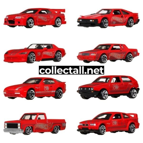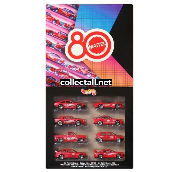 Hot Wheels 2025 yılına ait 8 farklı araçtan oluşan Mattel 80th Anniversary 8'li paket. Paket içerisindeki araçlar ‘82 Toyota Supra, 87 Buick Regal NGX, ’83 Chevy Silverado, BMW M3 Race, Dodge Viper RT/10, '89 Porsche 944 Turbo, Volkswagen Golf Mk2 ve Nissan Skyline GT-R (R32).